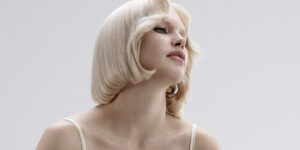 Perfekte Geometrie in perfekter Länge. Am Tag zeigt der Bob viel Dynamik und das Make-up scheint beinahe transparent. Wellen transformieren den Schnitt in den Abend und das Make-up wird mystisch.